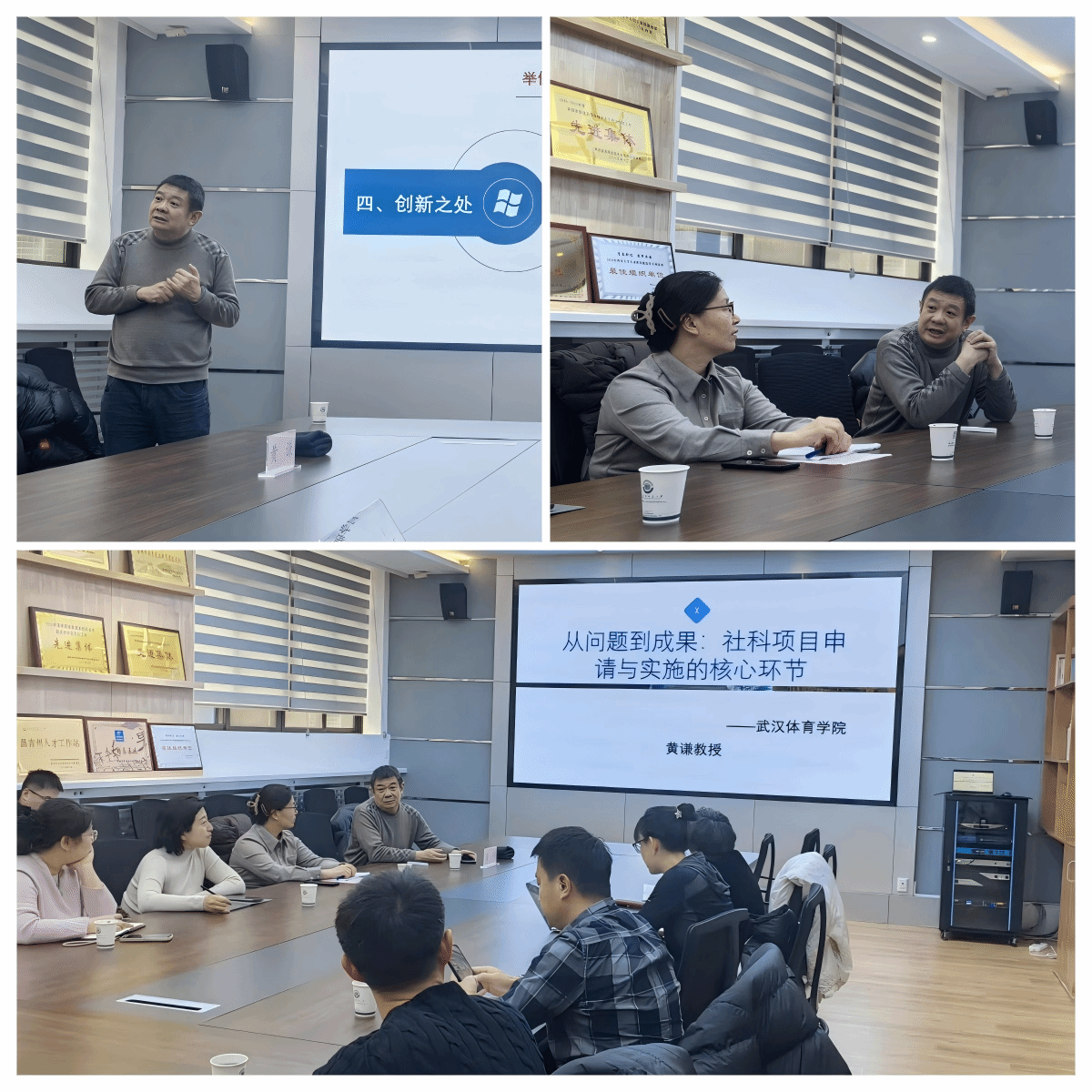 2026 年1月 19 日下午,武汉体育学院博士生导师黄谦教授以“从问题到成果:社科项目申请与实施的核心环节”为题,带来干货满满的实战指南。黄谦教授深耕社科项目研究多年,总结出覆盖全流程的操作规范,从课题命名到结题验收逐一拆解核心环节,为教师们提供了系统完整的申报与实施解决方案。