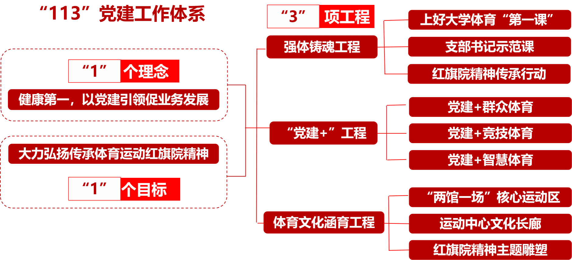 体育学院党建工作坚持以思想引领推进特色发展,构建“113”党建工作体系,有效推动党建和业务工作融合发展,为各项工作高质量推进提供坚强组织保证。工作体系即:(一个理念)牢固树立“健康第一”教育理念,(一个目标)聚焦传承体育运动红旗院精神目标任务,大力开展培根铸魂工程特色育人、“党建+”工程全方位引领、体育文化涵育工程以体育心等三项工程。