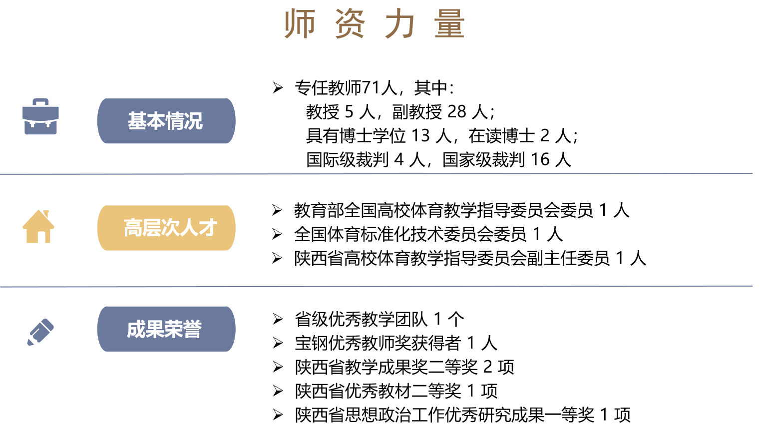 体育学院现有教职工86人,其中,专职教师71人,专职教师中,教授5人,副教授28人;国际级裁判4人,国家级裁判16人,教育部全国高校体育教学指导委员会委员1人,全国体育标准化技术委员会委员1人,陕西省高校体育教学指导委员会副主任委员1人。