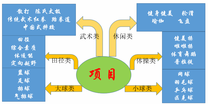 我校大学体育三,大学体育四两个学期的体育课程为专项选修课,开设课程项目分为六个大类: